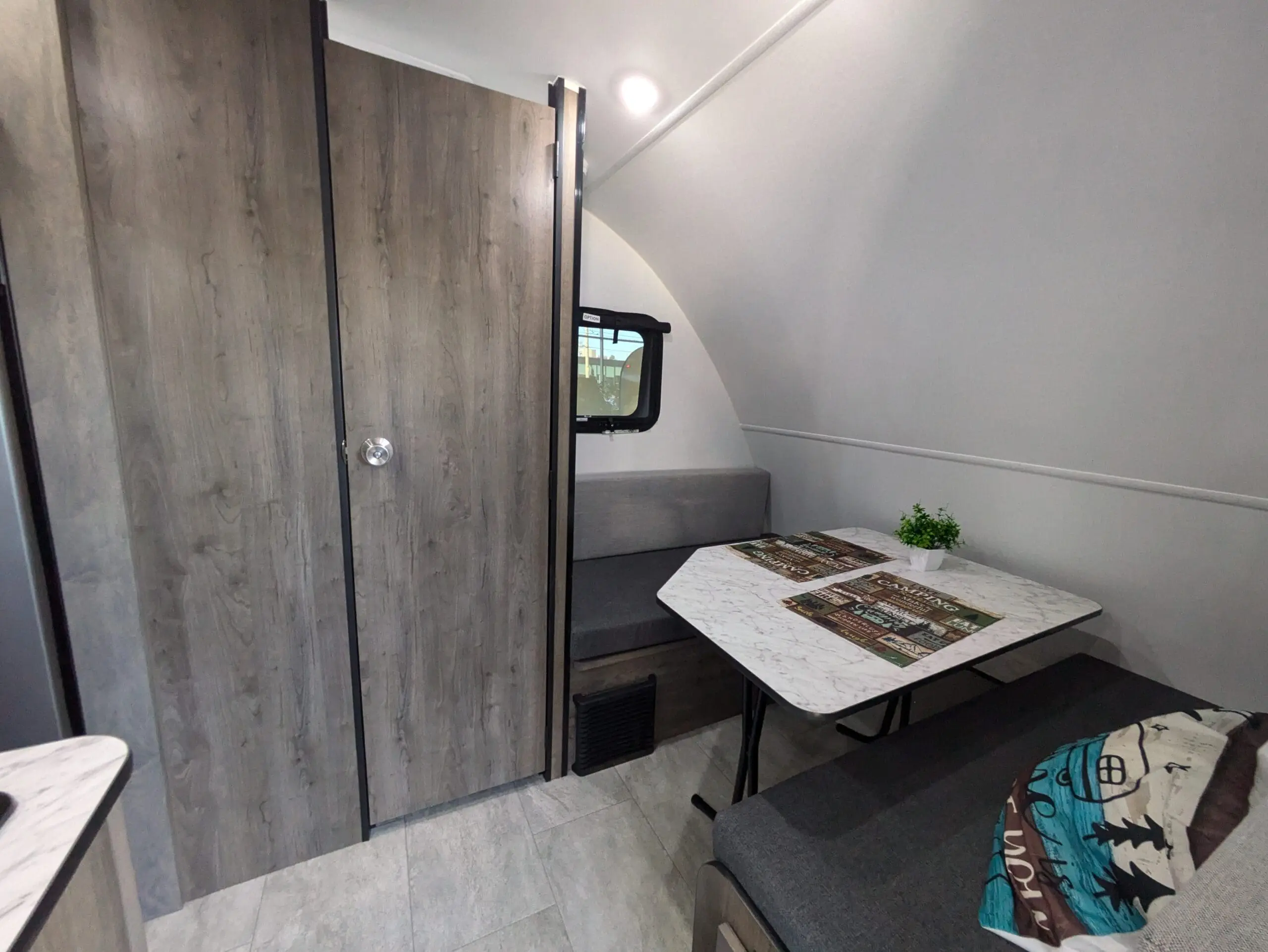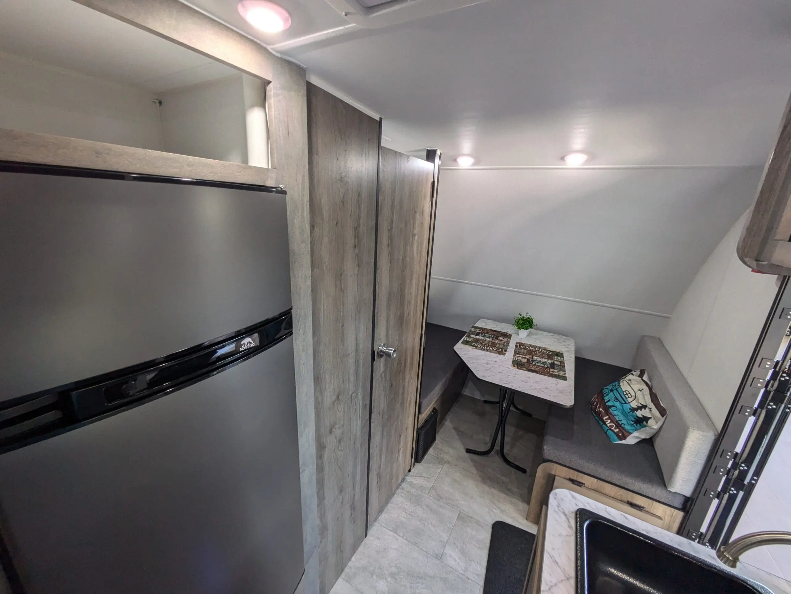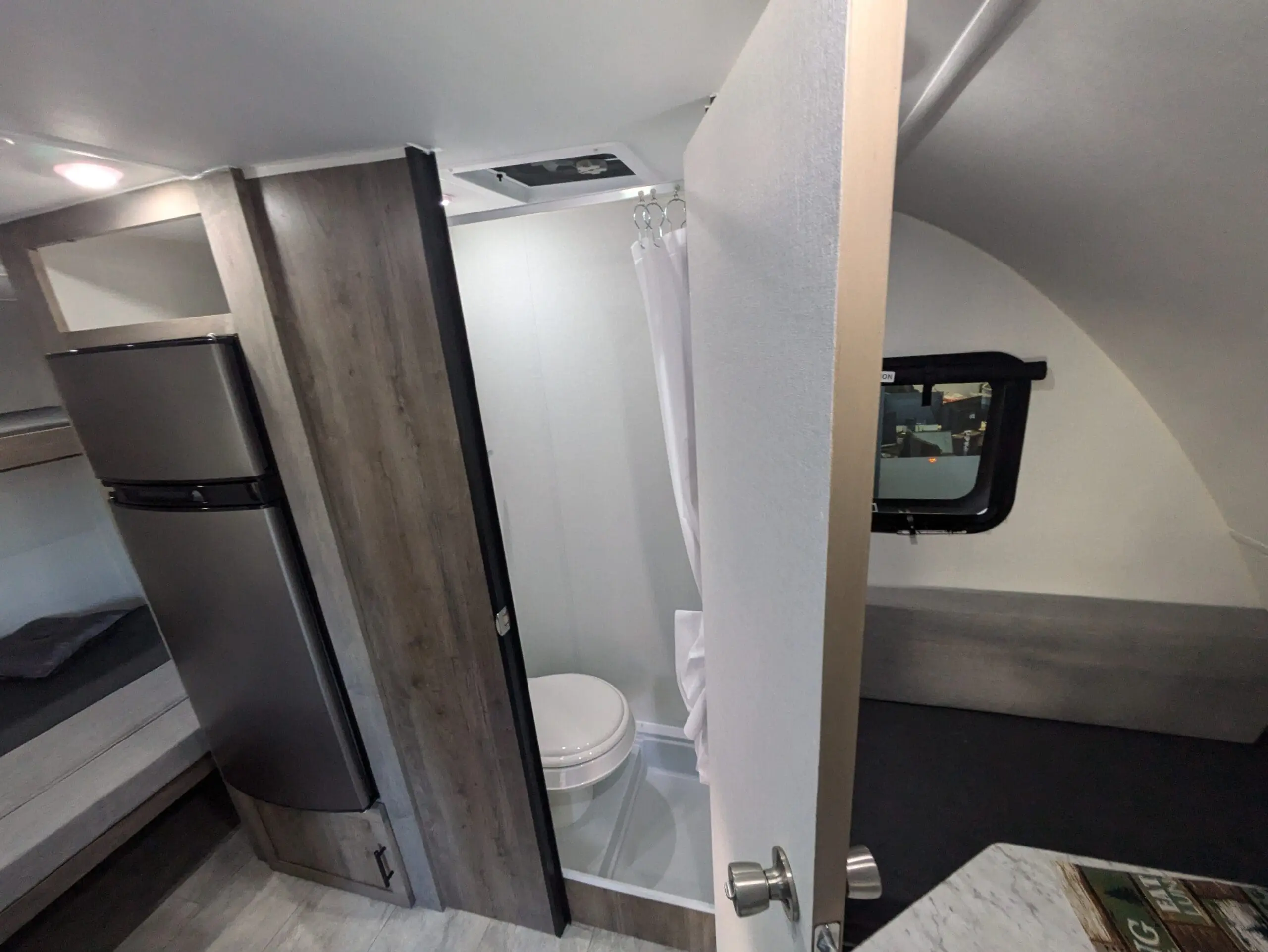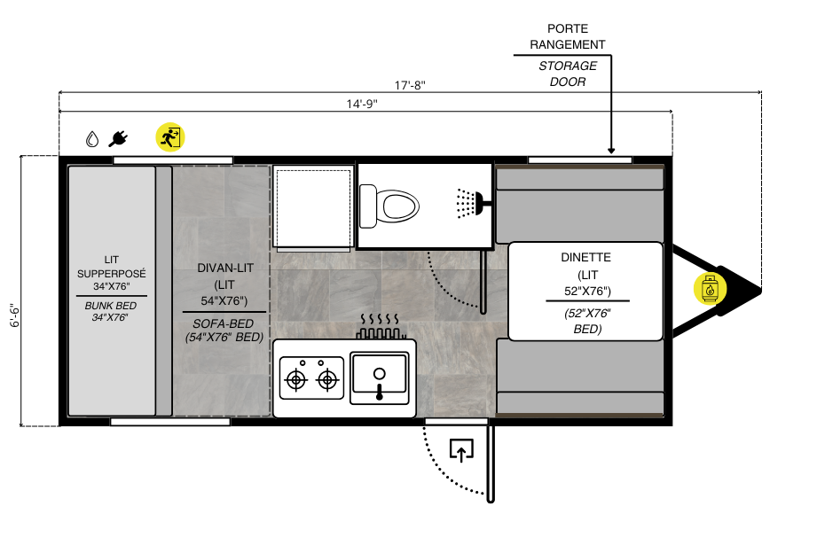With its two convertible adult beds and a bunk bed for children under 125 lb, it comfortably accommodates 4 to 5 campers. Its practical layout includes a cooking area, a compact refrigerator, a toilet, and a shower — the basics for traveling in simple, functional comfort.